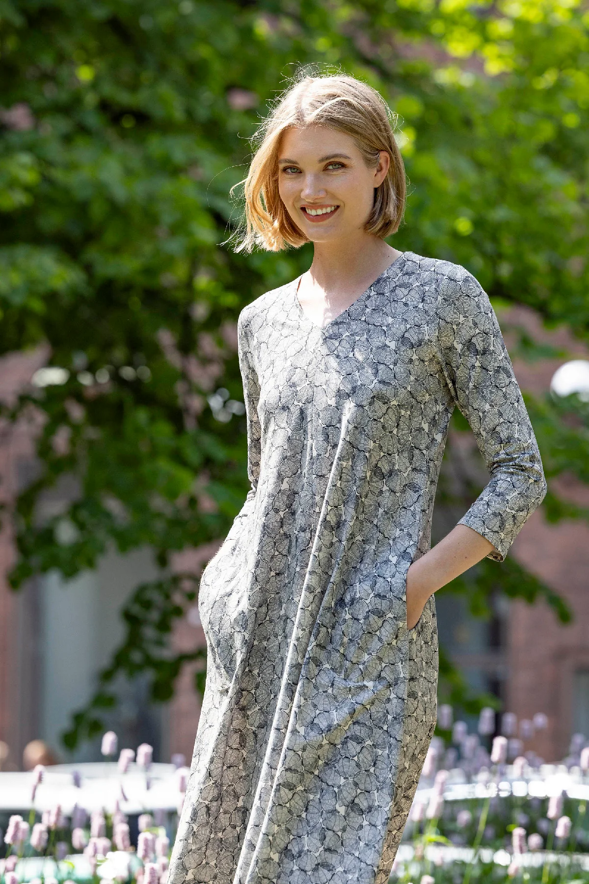 Naisellisen LOISKE-mekon materiaali on kauniisti laskeutuvaa kuosillista viskoositrikoota, jossa on hieman elastaania joustoa antamassa. Vaaleanbeigen mekon kuosina on tummansinisiä tyyliteltyjä simpukoita. Taskullinen mekko on hartioistaan siro, mutta se levenee helmaan. Materiaalin vinoleikkaus antaa tuotteelle kauniisti pukevan ja kellomaisen helman. Mekossa on V-pääntie ja kyynärpäiden yli ulottuvat hihat. LOISKE-mekko on suunniteltu Suomessa ja valmistettu Virossa.